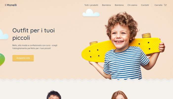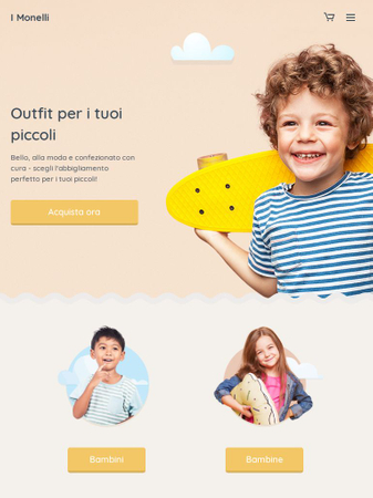 Vendi i tuoi meravigliosi vestiti per bambini e mostra i tuoi lavori online! È il modello perfetto per il tuo negozio di abbigliamento e accessori online. Prodotti alla moda, design attraente e processo d'acquisto facilissimo. Il tuo e-commerce avrà successo assicurato.