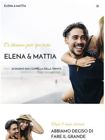 Questo modello vivace ti aiuterà nell'organizzazione del tuo matrimonio. Condividi la vostra storia d'amore con gli invitati, descrivi l'evento e scopri chi parteciperà.