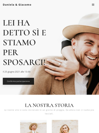 Stai pensando di fare un matrimonio in stile rustico? Allora crea il tuo sito web nello stesso stile. Questo modello che richiama la natura è perfetto per te. Condividi i dettagli importanti con tutti i tuoi ospiti e chiedi loro tutto ciò che è necessario sapere per un'organizzazione senza problemi attraverso un semplice modulo invitati.