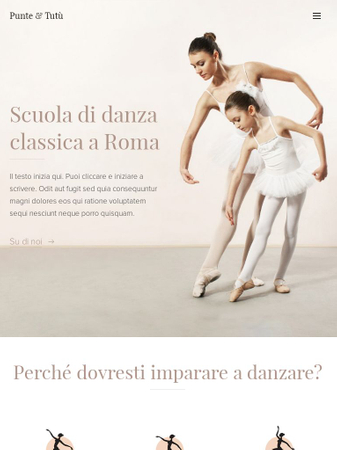Questo modello sarà la soluzione ideale per la tua scuola di ballo o danza classica. Uno schema di colori e delle immagini delicate corrispondono alla grazia della danza, mentre i contenuti offrono ogni cosa di cui i tuoi studenti possano aver bisogno. Aggiungi il calendario delle lezioni, presenta gli insegnanti o scrivi un articolo blog sull'ultima esibizione. La presenzazione della tua scuola di danza sarà perfetta!